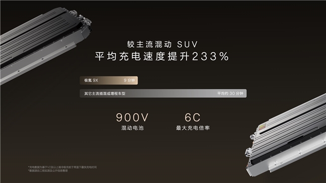 极氪9X首发搭载浩瀚超级电混技术,依托浩瀚-S超级电混架构的全栈900V高压优势,实现“满电快、馈电快、续航长、充电快”的极致体验。全球首套三电机兆瓦级混动电驱系统,综合输出超1400匹马力,零百加速仅3.1秒,问鼎全球加速最快旗舰SUV。与宁德时代联合开发的900V混动专用电池,提供380公里与300公里两种纯电续航方案,均支持6C超快充,20%至80%充电仅需9分钟。145千瓦全球最高功率增程发电机的加入,更让高速馈电工况下实现“越跑电越多”。